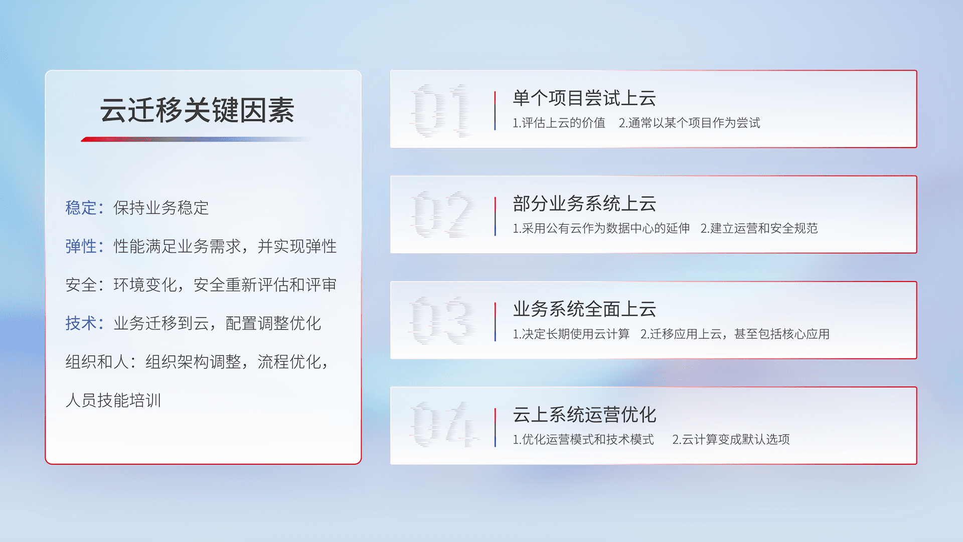 结合实际业务,,从规划设计、、、、云平台选型、、云原生改造、、数据迁移、、、、集成交付,,,迁移全过程为客户识别最佳上云路径,,,做好风险识别管理,,,设计网络架构、、身份权限、、、、安全审计合规、、操作审计、、日志审计、、、、监控告警策略、、多站点容灾设计等,,对云上基础设施进行整体规划,,,提升IT治理水平,,以满足弹性、、高可用、、、、高性能的需求。。