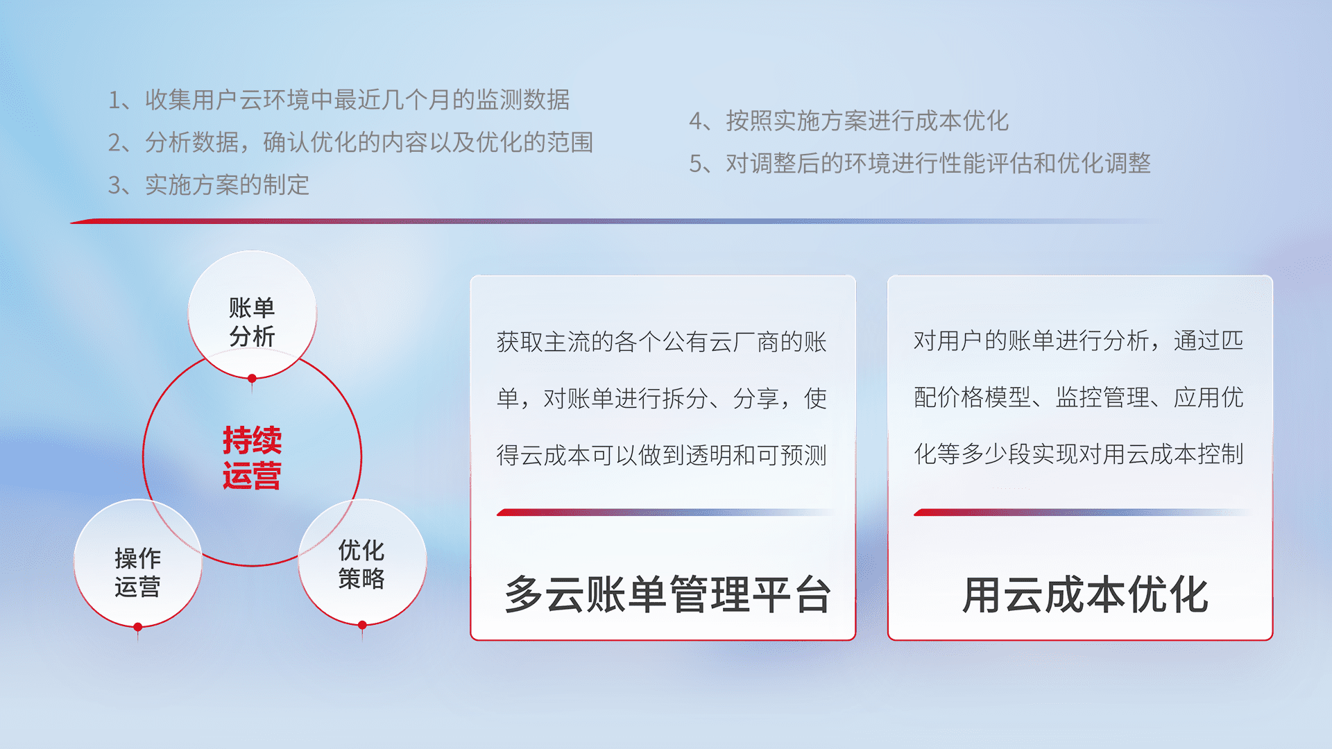 通过多云纳管,,以统一的资源数据模型把客户的云资源进行抽象和封装,,,进而实现对多云资源的统一操作,,保障云资源管理的可靠性、、、、稳定性与可用性。。量身定制化运维内容,,,配置、、、开发运维、、、、补丁管理、、备份、、、、监控、、、、认证和访问管理、、、、审计和日常巡检等,,,,保障在用云过程中的可靠度,,稳定度以及高可用率。。